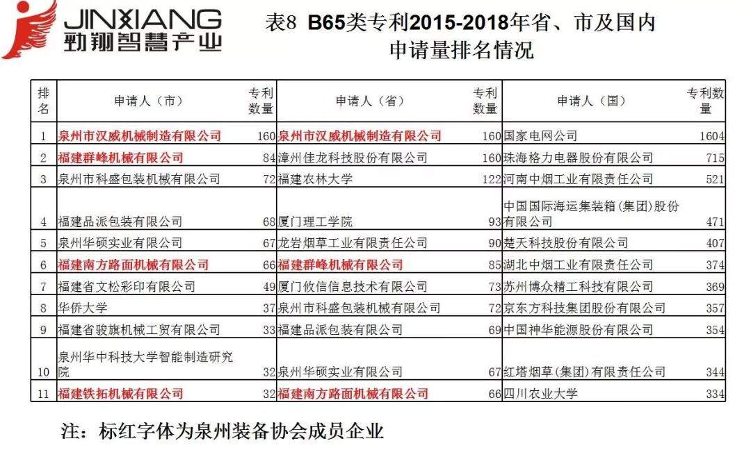 如漢威機(jī)械連續(xù)3年,在省、市專利(B65類)申請量方面位于前列;群峰機(jī)械2018年獲得了“國家知識產(chǎn)權(quán)優(yōu)勢企業(yè)”,并且得分高于90分以上。