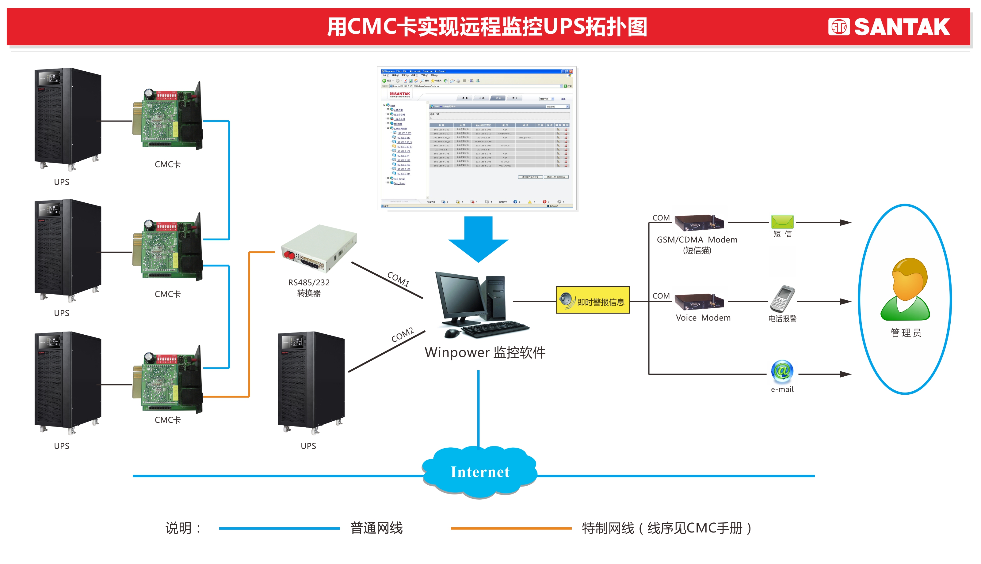 NMC 是一種介于UPS和網(wǎng)絡(luò)的設(shè)備,它可以從UPS獲得狀態(tài)信息并且發(fā)出指令。NMC支持兩種協(xié)議-簡易網(wǎng)絡(luò)管理協(xié)議(SNMP)和超文件傳輸協(xié)議(HTTP)以供使用者進入。通過SNMP的網(wǎng)絡(luò)管理站(NMS)和網(wǎng)頁瀏覽器,用戶可以獲得UPS的狀態(tài)信息、發(fā)出指令至UPS并且通過網(wǎng)絡(luò)設(shè)定NMC。